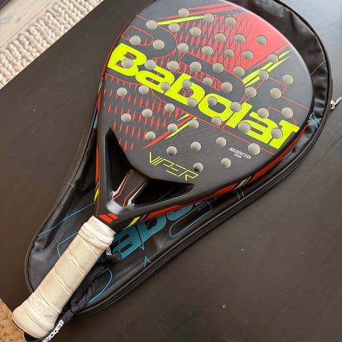 Prince Power Level padelracket i rosa färg. Racketen har ett hålmönster och är designad för padelspel. Behöver en ny linda.