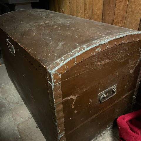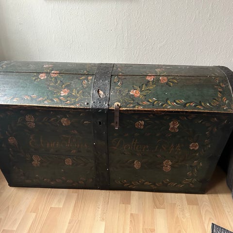 Antik träkista från 1829 i mörkbrunt trä med metallspännen. Passar som förvaringsmöbel eller dekorativt föremål.