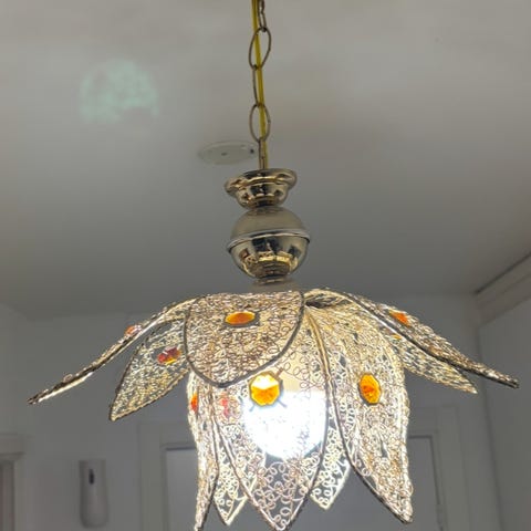 Taklampa med dekorativa blad i metall och färgade detaljer. Lampan är upphängd i en kedja och har en unik design som liknar en blomma.