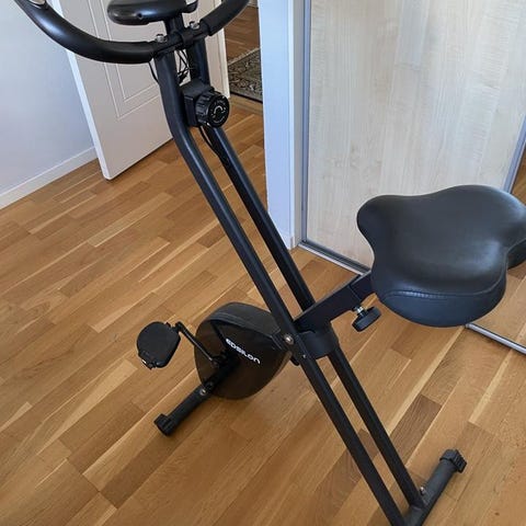 Domyos Woodbike träningscykel tillverkad i trä med svart ram och pedaler. Utrustad med justerbart säte och handtag för anpassad träning. Maxvikt 120 kg. Designad för inomhusträning och konditionsövningar.