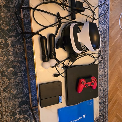Sony PlayStation 4 spelkonsol inklusive två DualShock 4 handkontroller och PlayStation VR headset. Systemet används för spel och virtuell verklighetsupplevelse.