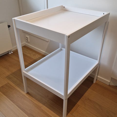 JLY barnmöbel skötbord i grått med mätsticka och metallram. Skötbordet är utformat för att underlätta blöjbyten och har en stabil konstruktion. Produkten visar viss användning och mindre skador på tyget vid ena hörnet.
