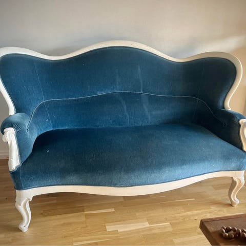 Vacker nätt liten soffa i rokokostil. Grön klädsel. Hämtas i Vasastan.