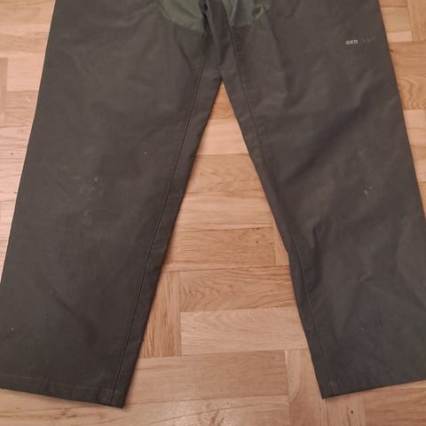 Byxa med hängslen i grönt med oranga detaljer. Byxan har justerbar midje i viss mån och flera fickor på benen . Materialet är robust. Tjockt fordrad. One size. Från grenen neråt 77 cm.