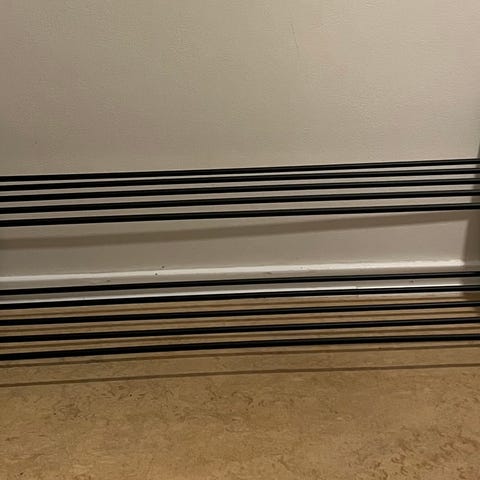 Skohyllan har två metallhyllor för förvaring av skor och en vadderad sittdyna för bekväm sittplats.