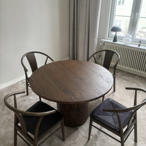 Matbord i massiv ek med måtten 180 x 100 cm. Höjd 75 cm. Bordsskiva i bra skick, fåtal märken och kan slipas till nyskick. Infästningen till ett av benen skulle behöva fixas till.