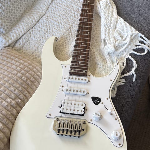 Ibanez Elgitarr i cremevit färg. Elgitarren har två aktiva humbucker-pickuper, justerbar stall och tre reglageknappar för volym och ton. Den är utrustad med sex stämskruvar på huvudet och ett greppbräde i mörkt trä. Bra gitarr för både nybörjaren och den erfarne gitarristen. Hyfsat hard case medföljer för att kunna skickas.