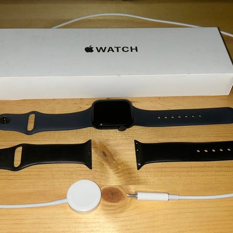 Apple Watch Series 3 smartklocka med svart armband. Modellen är A1858 och har en maximal batterikapacitet på 84 %. Inkluderar laddningskabel.