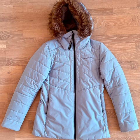 Svart jacka med luva och pälskrage. Jackan har en patch med texten ”Zavetti Canada” och en kanadensisk flagga på ena ärmen. Den har dragkedja och knappar fram, samt flera fickor.