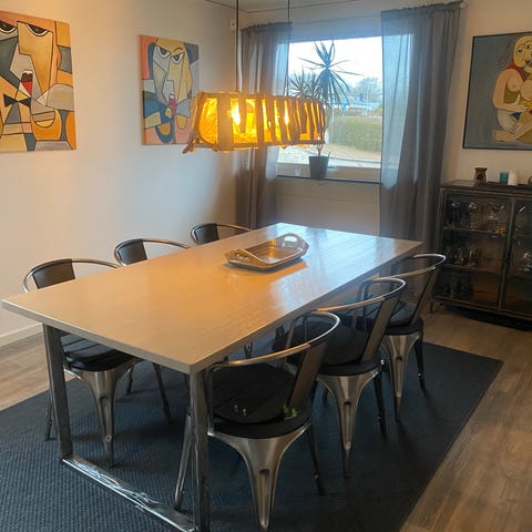 Matbord fräckt mönster oval modell med stabila kromade ben. Finns 2 stycken iläggs skivor,mått utan skivor är ca 3 meter OBS!! Stolarna ingår inte.