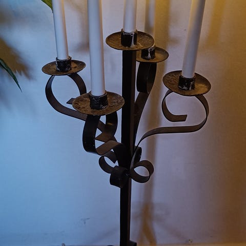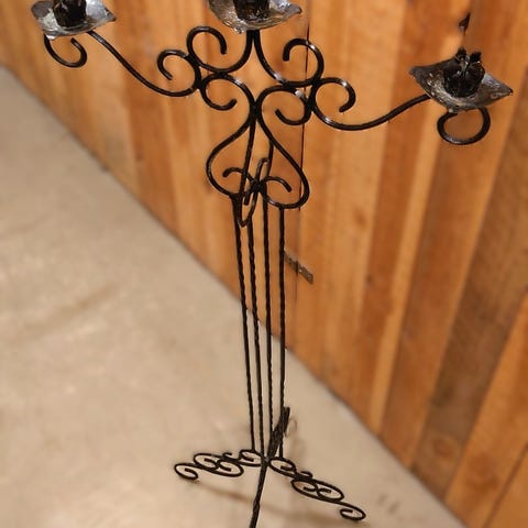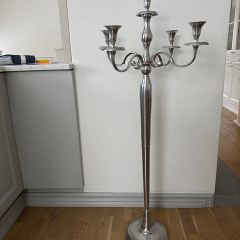 Stor ljusstake / golvkandelaber med plats för fem ljus. 98 cm hög, 40 cm i diameter och silver. Stabil konstruktion.
