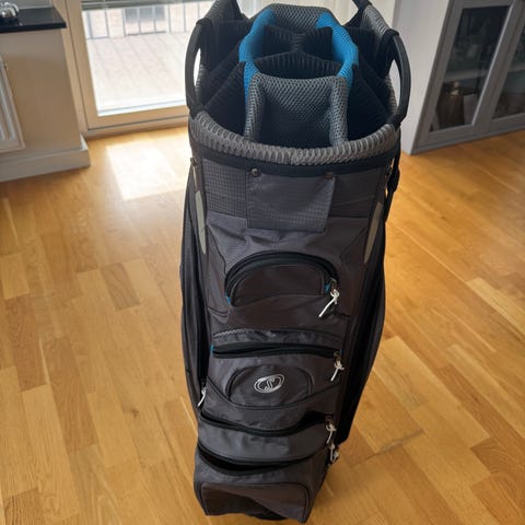 En Vagn golfbag i svart färg med flera fack för förvaring. Lite äldre men gör jobbet fint, en liten dragkedja glappar lite men inget som påverkat mig. Får med en bollhov. Hör av er vid frågor. Vid smidig deal kan pris diskuteras.