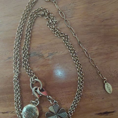 Guldfärgat Pilgrim halsband med fasta berlocker. Bra skick