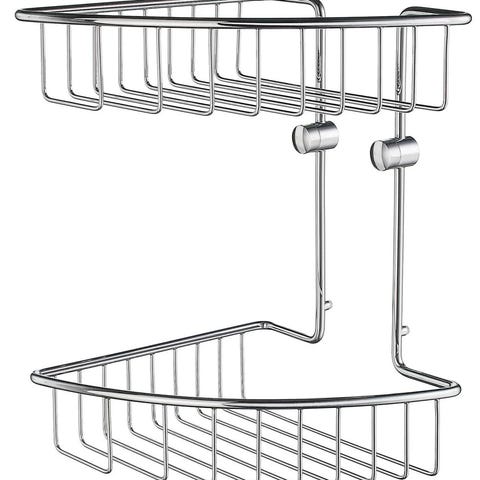 En stilren dubbel hörnduschkorg i polerad krom får dina schampoflaskor från golvet eller badkarskanten. Duschkorgen är försedd med två krokar att hänga duschborstar och exfolieringshandskar på. Korgen bidrar dessutom till en mer hygienisk miljö då du slipper ansamlingar av vatten och fula märken. Eftersom hörnduschkorgen finns i badrummet ställer det extra stora krav på materialet. Den här hyllan är tillverkad av massiv mässing vilket betyder att du aldrig behöver oroa dig för rost.