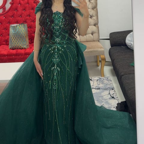 Figurnära bröllopsklänning med långa ärmar och djup ringning i ryggen. Klädda knappar följer hela kjolens baksida och släp (extra knappar medföljer).