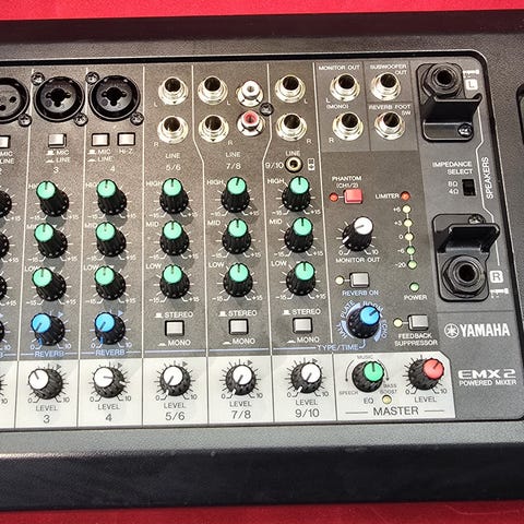 Yamaha ljudutrustning inklusive mixerbord med flera ingångar och kontroller samt två svarta högtalare. Utrustningen är avsedd för ljudförstärkning och kan användas vid olika evenemang eller inspelningar.