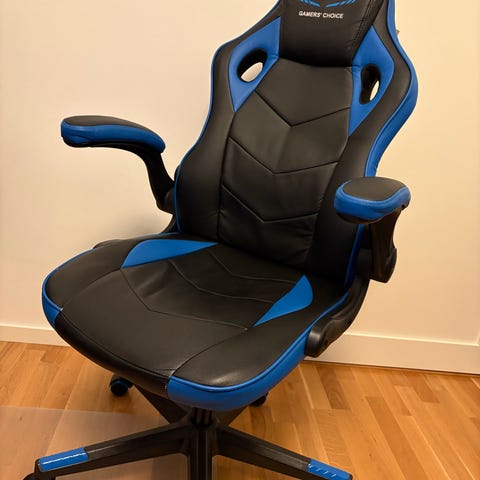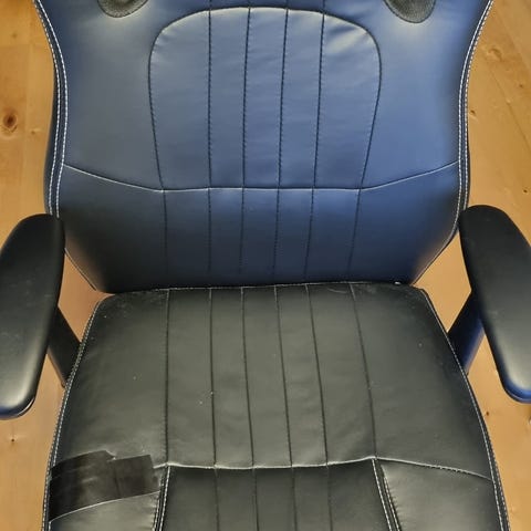 Säljer en bekväm och stabil gaming- eller kontorsstol i svart med vita detaljer. Stolen har hög rygg, armstöd och hjul, vilket gör den skön att sitta i både vid arbete och spel.