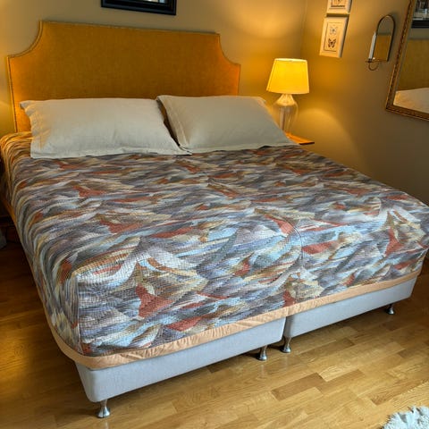 Trevligt och fint sängöverkast 170 x 250, blommönster på ena sidan och randigt på andra sidan, inköpt på Åhléns.
