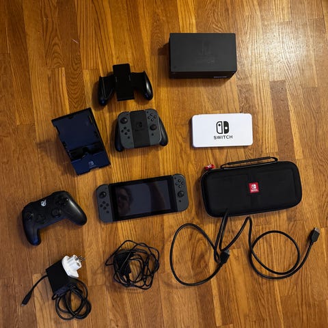 Nintendo Switch spelkonsol med flera spel, 4 handkontroller i olika färger (svart, röd, grön, grå) och tillbehör som handkontrollhållare och extra handkontroller. Spelen inkluderar bland annat Mario Kart, Spyro och andra Nintendo Switch titlar. Konsolen och tillbehören är avsedda för användning med Nintendo Switch systemet. Inkl väska och dockningsstation. Allt fungerar felfritt.