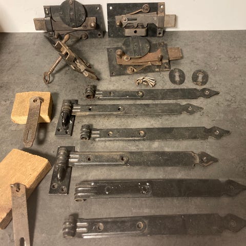 Antik lås i smide med nyckel, avsedd för dörrar eller skåp. Låset är tillverkat i metall och har ett robust utförande med synliga nitar. Nyckeln är rund med ett enkelt handtag för manuell användning. Passar för traditionell låsning och kan användas i restaurering av äldre möbler eller dörrar.