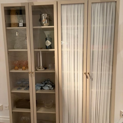 Två överskåp till bokhyllan Billy med vitrindörrar (Oxberg), vita med svarta knoppar (två av bilderna är från Ikeas webbplats, varför de vita originalknopparna syns): ett överskåp är 80 cm brett med dubbla dörrar och ett är 40 cm med enkel dörr.