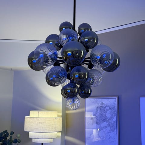 Exklusiv modell i mässing med åtta klotformade glas (bubble/globe). Ger ett mycket vackert och stämningsfullt ljus – perfekta över matbord, i vardagsrum eller större hall.