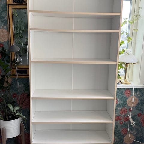 Säljer en vit hylla från IKEA JONAXEL i metall med 5 hyllplan, stabil och i mycket fint skick.