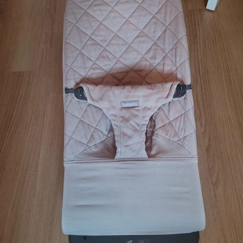 Fin babysitter i vitt meshtyg med svart kant säljes tillsammans med lekbåge. Sittern är i gott skick, det svarta tyget är dock något solblekt.