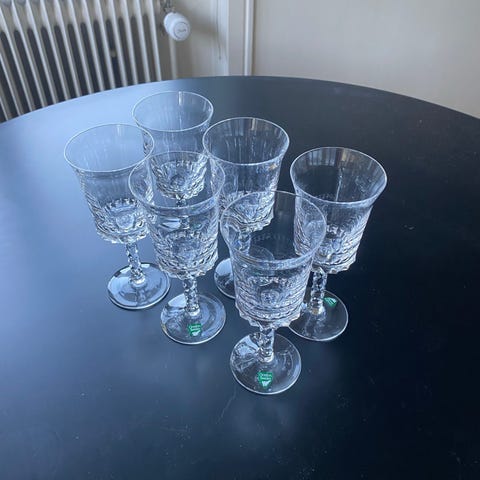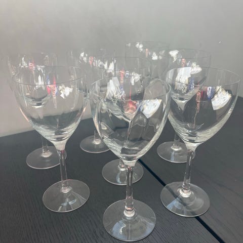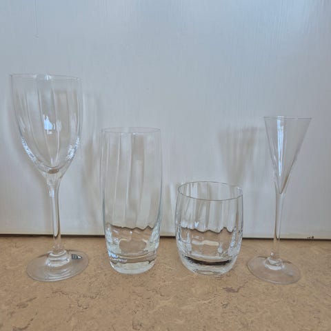Fyra stycken Orrefors Optica symphony rödvinsglas och en Orrefors Optica symphony vitvinsglas. Alla glas har originalkartong.