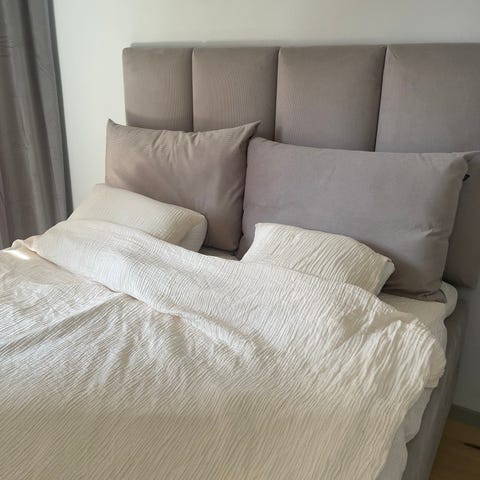 Tempur säng sälj tillsammans med 2 st sängbord och gavel. Överkast och kuddar på bild ingår.