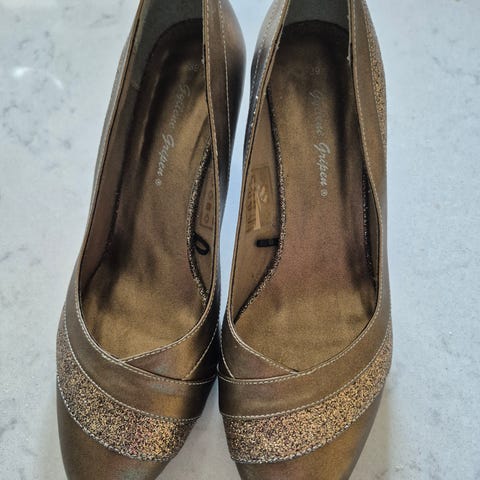 klackskor i storlek 39 med öppen tå och dekorativa strass detaljer fram. Skorna har en hög klack och är silver färg, lämpliga för formella eller festliga tillfällen.