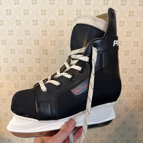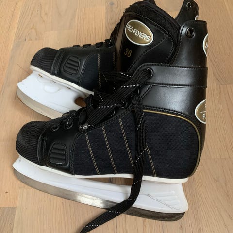 Ishockeyskridskor för barn i storlek 37, svart och vit färg. Skorna är avsedda för ishockey och har snörning för justerbar passform.