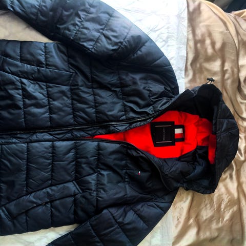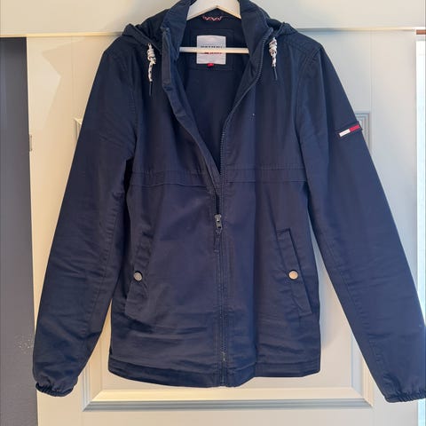 Grön Tommy Hilfiger Denim jacka med en stor pälskrage på huvan. Jackan har en dragkedja och knappar framtill, samt flera fickor. Insidan är fodrad med ett mjukt, fluffigt material.