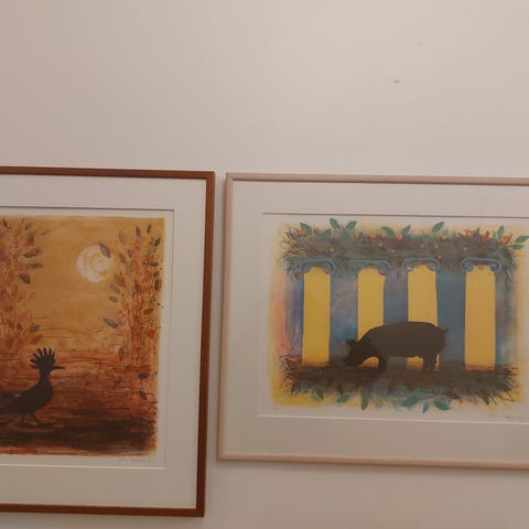 Två tavlor med konstmotiv i ramar från W. Lundell AB Ram- & Spegelfabrik, placerade i träfärgade ramar. Tavlorna visar olika konstnärliga scener med figurer och dekorativa element. Ramarna är försedda med upphängningsanordning på baksidan. Tillverkade och förpackade av W. Lundell AB, Olovsgatan 72, Uppsala.