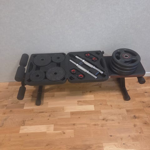 Träningsbänk med justerbart ryggstöd och sittdyna i svart och rött material. Inkluderar ett viktset med flera viktskivor av metall samt en skivstång med lås. Passar för styrketräning och hemmabruk.