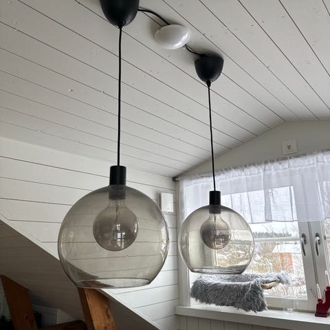 3 st sotade lampor från IKEA av märket Jakobsbyn. Ihopsatta med en takupphängning i olika längder. Lamporna är hela och i fint skick. Ljuskällorna ingår.
