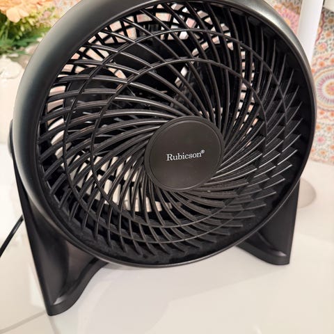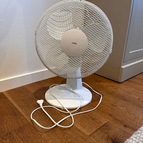 Vit bordsfläkt med skyddsgaller och tre fläktblad.