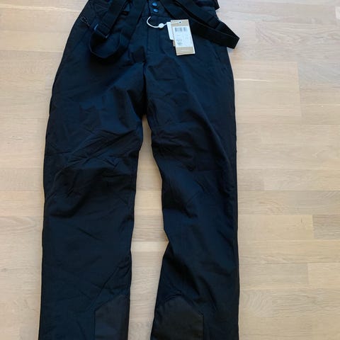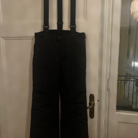 Orangeröda skidbyxor med svarta detaljer och hängslen. Använda en säsong, lite slitna vid benen, se bild. Storlek 164.