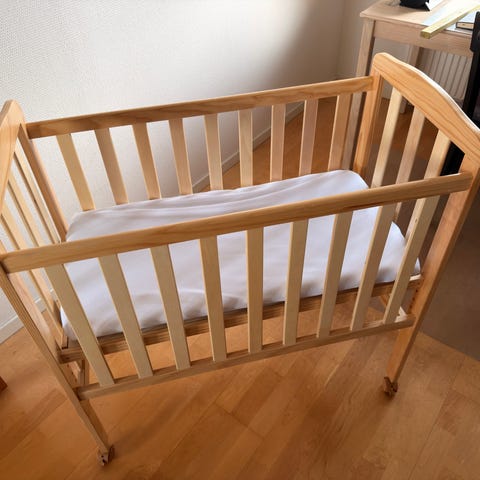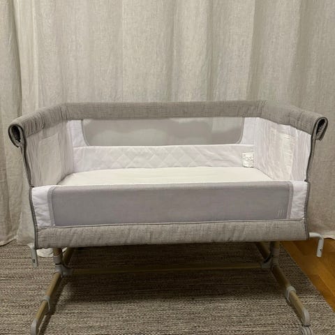 Bedside crib i grått trä. Gott skick. Inga hjul på crib’ets ben.