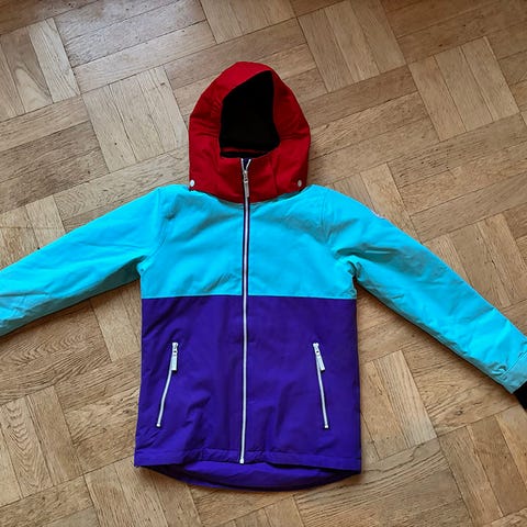 Färgglad jacka i rosa och beige med en svart huva. Jackan har dragkedja fram och fickor på sidorna. Upphängningen är sönder, se bild.