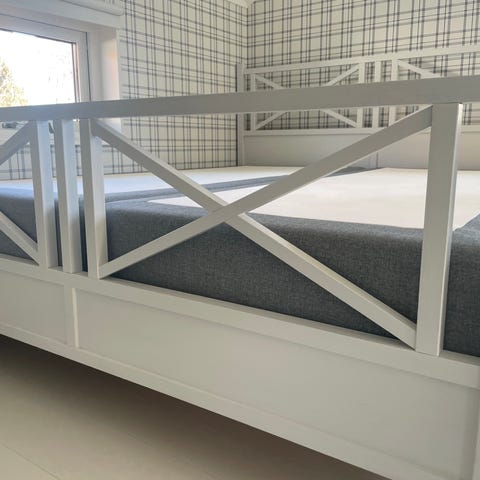 Sänggaveln gulnad i undre delen, syns inte när sängen står på plats.