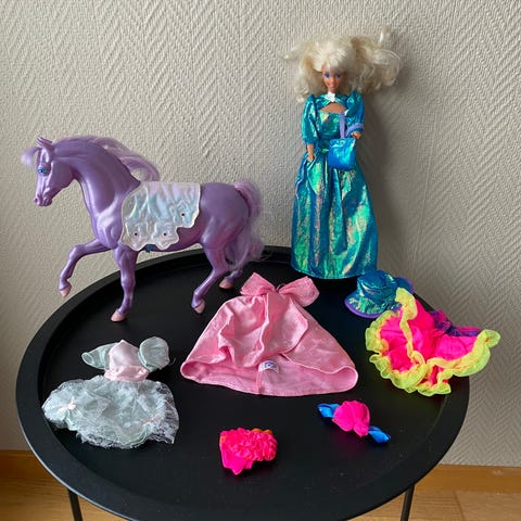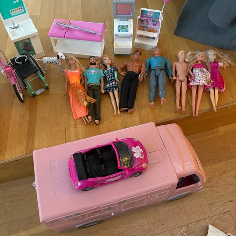 Ett paket med olika Barbie-dockor samt diverse tillbehör.