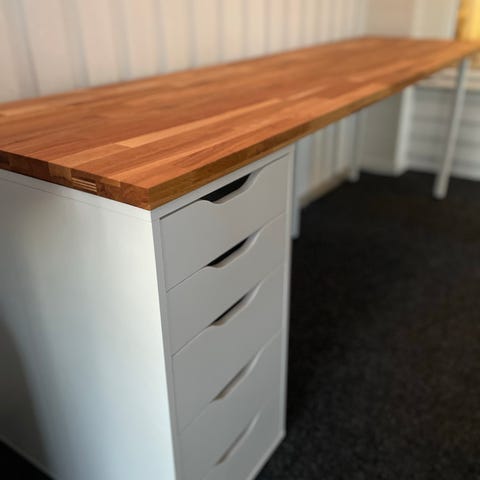 Säljer nu mitt skrivbord som är i köpt 2023. Är fastmonterad och går ej att plocka isär så krävs förmodligen släp eller skåpbil vid hämtning. Kan hämtas i Färjestaden på Öland. Skrivbordet är i bra skick och finns med ett nät för kabeldragning undertill.