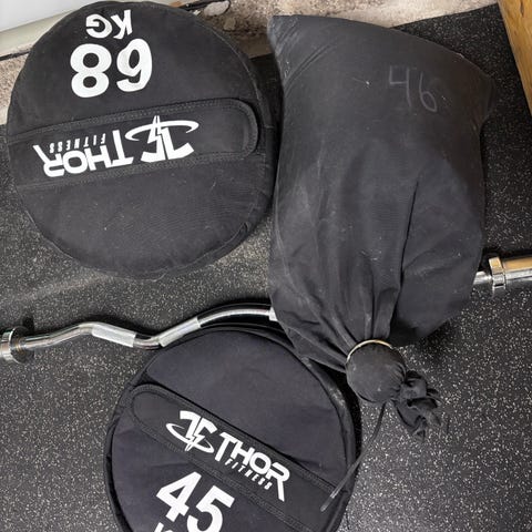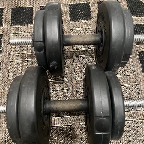 Dumbbellset med totalt 18 kg vikt, inklusive viktskivor, handtag och låsmuttrar i svart färg. Setet levereras i en praktisk bärväska för enkel förvaring och transport.