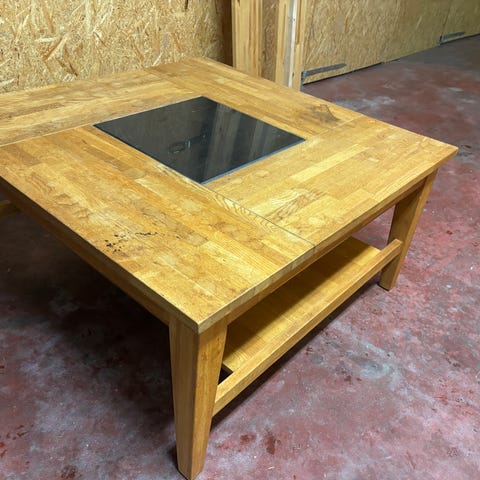 Fyrkantigt soffbord med två inlagda stenskivor. I bra skick men det finns en liten spricka på ca. 3 cm i faneret.
