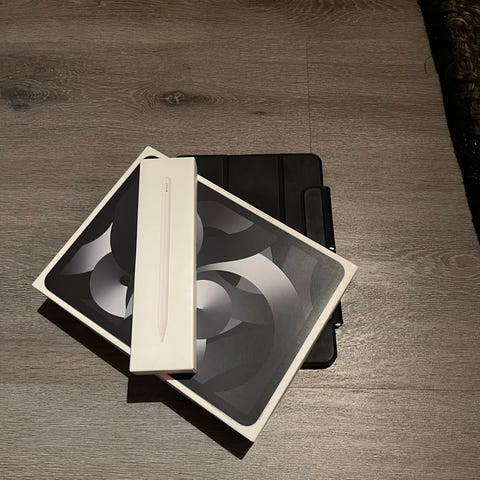 iPad Air 5e generationen samt Apple pen gen 2, i mycket bra skick. Inköpta våren 2024 och var tänkt som ritplatta men har inte blivit av. I paketet ingår även ett stå-skal och ett oöppnat skärmskydd med ”paper texture”.