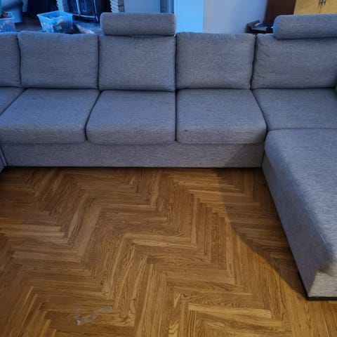 Vit hörnsoffa i skinn med flera sittplatser och nackstöd. Soffan är utformad för att ge komfort och passar för vardagsrumsmiljöer. Hämtas kalmar.