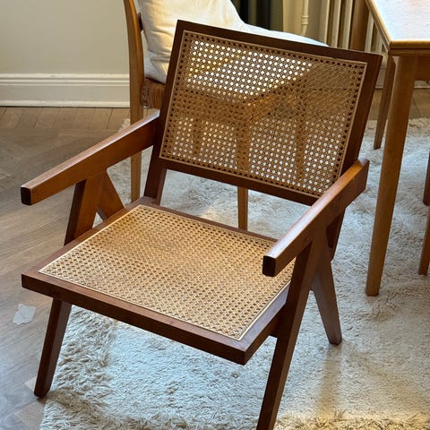 Stilren och tidlös loungestol med svart träram och handvävd rotting i sits och rygg. Stabil konstruktion, mycket fint skick och passar lika bra i matsal som i vardagsrum eller kontor.