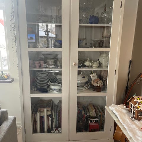 Pga flytt säljer vi detta fina antika vitrinskåp i massiv furu. Det har två lådor ovanpå och tre fack inuti. Vi har använt det till förvaring av leksaker i barnrummet. I gott skick förutom en vattenring och en liten fläck som går att ta bort med lite slipning. Passande nyckel finns till.