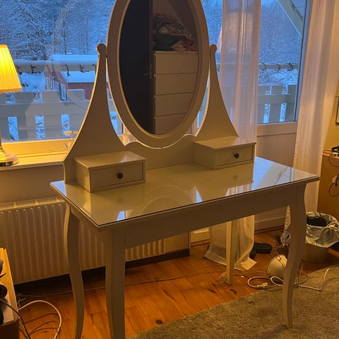 Sminkbord med förvaring på ena sidan med spegel. Plasten som betsat med fejk marmor ser inte så snygg ut. Man kan säkerligen ta bort den och putsa ordning den för att den ska bli perfekt
